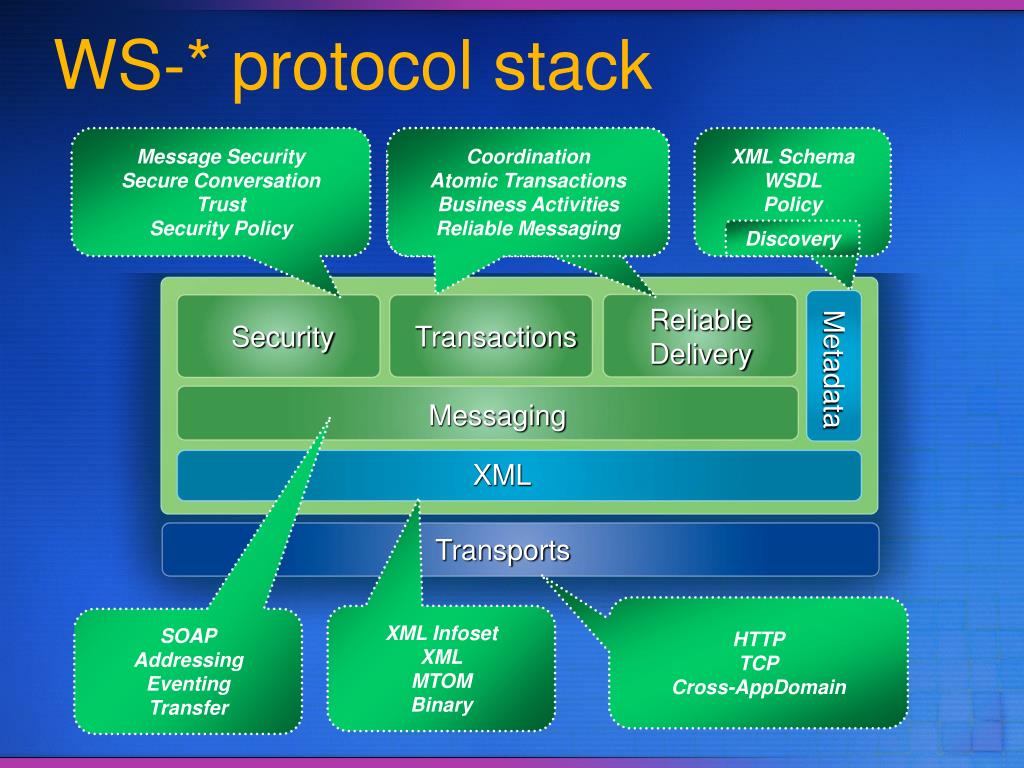 CoordinationAtomic Transactions Business Activities Reliable Messaging CoordinationAtomic Transactions Business Activities Reliable Messaging XML Schema WSDL Policy Discovery Discovery WS-* protocol stack Message SecuritySecure ConversationTrust Security Policy ReliableDelivery Security Transactions Metadata Messaging XML Transports HTTP TCP Cross-AppDomain XML Infoset XMLMTOM Binary SOAP Addressing Eventing Transfer