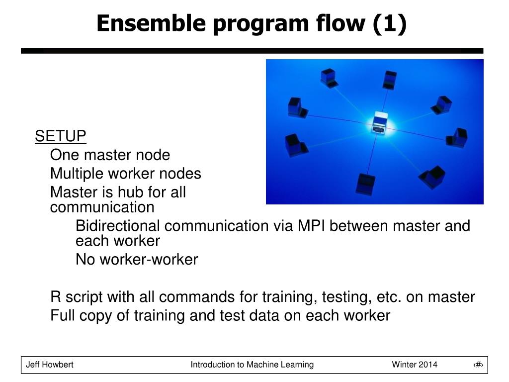 Ensemble program flow (1) • SETUP • One master node • Multiple worker nodes • Master is hub for allcommunication • Bidirectional communication via MPI between master and each worker • No worker-worker • R script with all commands for training, testing, etc. on master • Full copy of training and test data on each worker