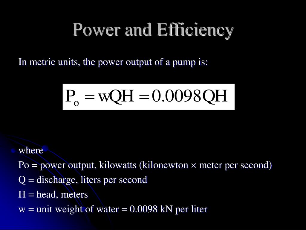 Power and Efficiency In metric units, the power output of a pump is: where Po = power output, kilowatts (kilonewton meter per second) Q = discharge, liters per second H = head, meters w = unit weight of water = 0.0098 kN per liter