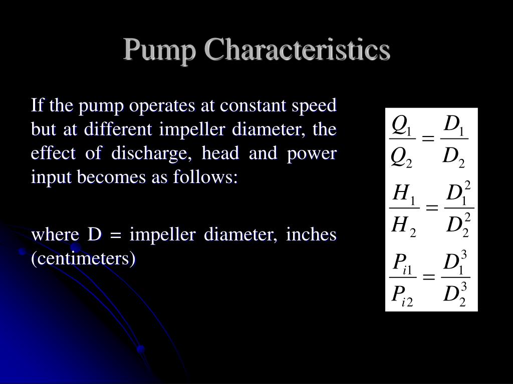 Pump Characteristics If the pump operates at constant speed but at different impeller diameter, the effect of discharge, head and power input becomes as follows: where D = impeller diameter, inches (centimeters)