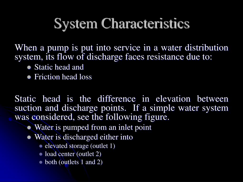 System Characteristics When a pump is put into service in a water distribution system, its flow of discharge faces resistance due to: • Static head and • Friction head loss Static head is the difference in elevation between suction and discharge points. If a simple water system was considered, see the following figure. • Water is pumped from an inlet point • Water is discharged either into • elevated storage (outlet 1) • load center (outlet 2) • both (outlets 1 and 2)