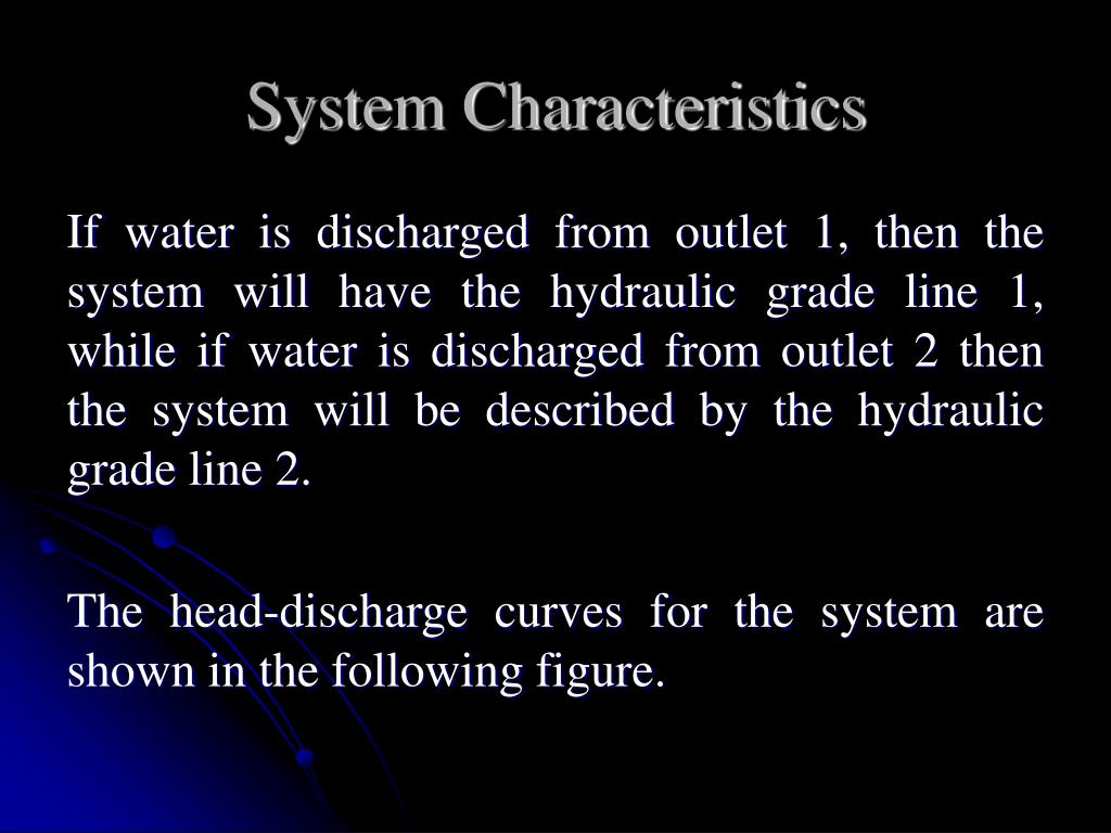 System Characteristics If water is discharged from outlet 1, then the system will have the hydraulic grade line 1, while if water is discharged from outlet 2 then the system will be described by the hydraulic grade line 2. The head-discharge curves for the system are shown in the following figure.