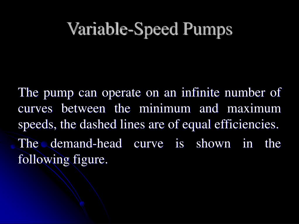 Variable-Speed Pumps The pump can operate on an infinite number of curves between the minimum and maximum speeds, the dashed lines are of equal efficiencies. The demand-head curve is shown in the following figure.