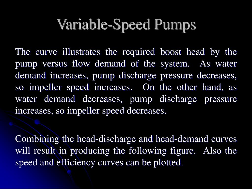 Variable-Speed Pumps The curve illustrates the required boost head by the pump versus flow demand of the system. As water demand increases, pump discharge pressure decreases, so impeller speed increases. On the other hand, as water demand decreases, pump discharge pressure increases, so impeller speed decreases. Combining the head-discharge and head-demand curves will result in producing the following figure. Also the speed and efficiency curves can be plotted.