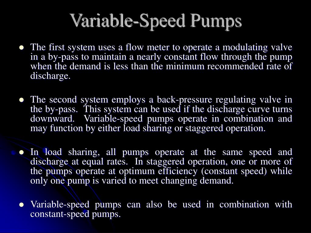 Variable-Speed Pumps At low water demand rates, the variable-speed drive should be prevented from running at very low speeds. So, when water demand is less than the minimum rate, pumps are designed to recirculate water through the pump in order to prevent the pump from damage. The recommended minimum discharge rate is between 25 and 35 per cent of the pumping rate at the best operating efficiency. The recirculation techniques are shown in the following figure.