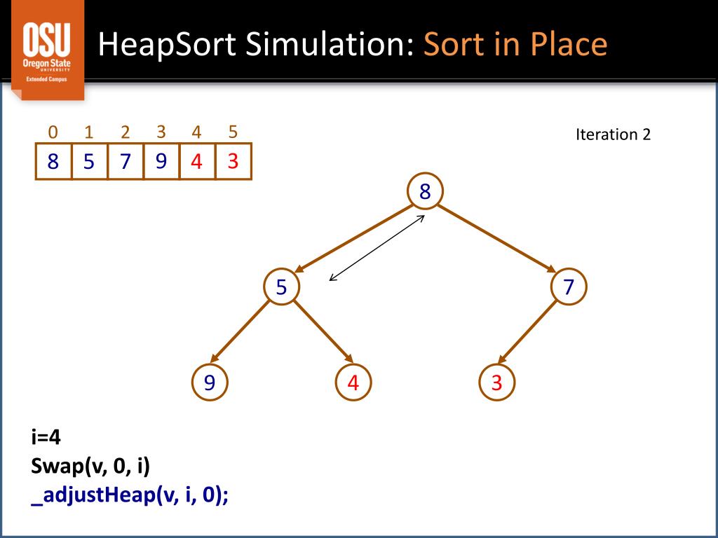 HeapSort Simulation: Sort in Place 3 5 5 3 0 9 1 8 2 7 4 4 Iteration 4 9 8 7 5 4 3 i=2 Swap(v, 0, i) _adjustHeap(v, i, 0);