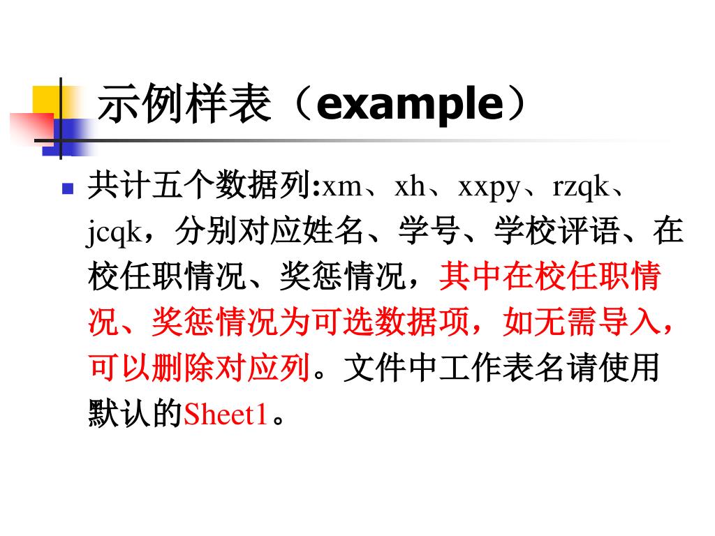 示例样表(example) 共计五个数据列:xm、xh、xxpy、rzqk、jcqk,分别对应姓名、学号、学校评语、在校任职情况、奖惩情况,其中在校任职情况、奖惩情况为可选数据项,如无需导入,可以删除对应列。文件中工作表名请使用默认的Sheet1。