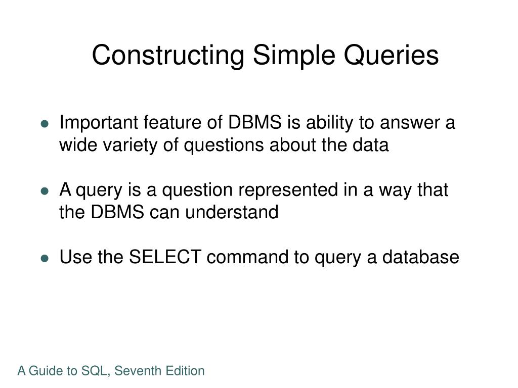 Constructing Simple Queries • Important feature of DBMS is ability to answer a wide variety of questions about the data • A query is a question represented in a way that the DBMS can understand • Use the SELECT command to query a database A Guide to SQL, Seventh Edition