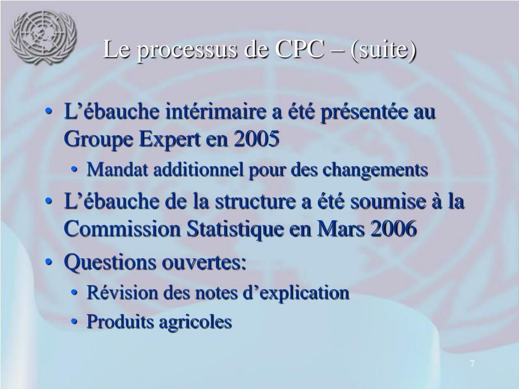 Le processus de CPC – premières étapes • Documents de discussion sur: • Questions de concept • Propositions spécifiques • Questionnaires envoyés aux pays en 2001 et 2003 (partie du questionnaire CITI) • Requête explicite pour des propositions et commentaires (distribuée en Juillet 2004) • Débats lors de la réunion du Sous-groupe Technique en Octobre 2004