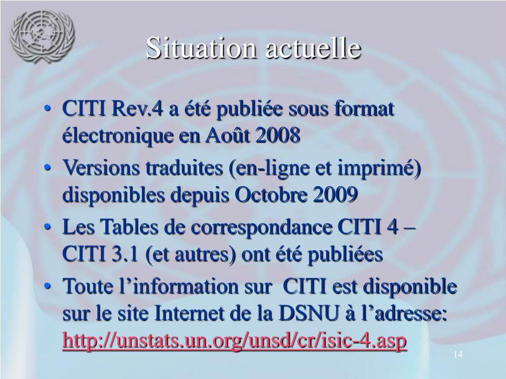 Situation actuelle • CITI Rev.4 a été publiée sous format électronique en Août 2008 • Versions traduites (en-ligne et imprimé) disponibles depuis Octobre 2009 • Les Tables de correspondance CITI 4 – CITI 3.1 (et autres) ont été publiées • Toute l’information sur CITI est disponible sur le site Internet de la DSNU à l’adresse: http://unstats.un.org/unsd/cr/isic-4.asp