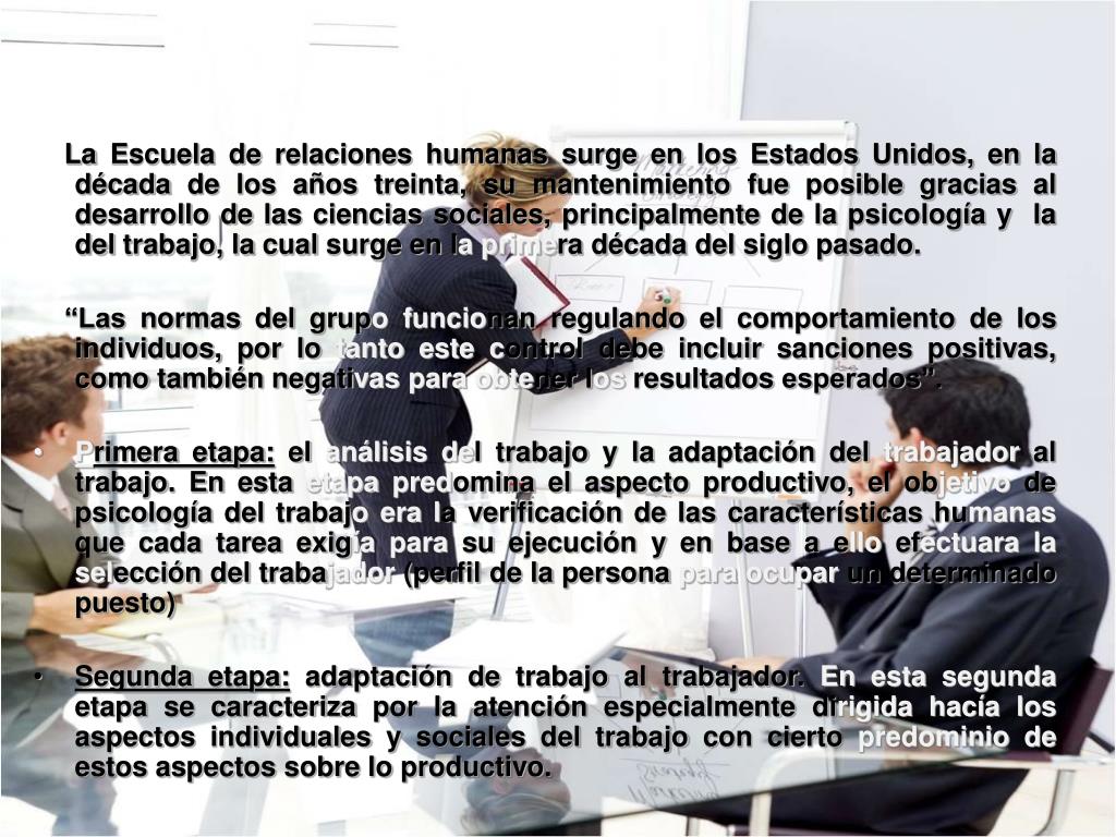La Escuela de relaciones humanas surge en los Estados Unidos, en la década de los años treinta, su mantenimiento fue posible gracias al desarrollo de las ciencias sociales, principalmente de la psicología y la del trabajo, la cual surge en laprimera década del siglo pasado. “Las normas del grupofuncionan regulando el comportamiento de los individuos, por lo tanto este control debe incluir sanciones positivas, como también negativas para obtener los resultados esperados”. • Primera etapa: el análisis del trabajo y la adaptación del trabajador al trabajo. En esta etapa predomina el aspecto productivo, el objetivo de psicología del trabajoera la verificación de las características humanas que cada tarea exigía para su ejecución y en base a ello efectuarala selección del trabajador (perfil de la persona para ocupar un determinado puesto) • Segunda etapa: adaptación de trabajo al trabajador. En esta segunda etapa se caracteriza por la atención especialmente dirigidahacía los aspectos individuales y sociales del trabajo con cierto predominio de estos aspectos sobre lo productivo.