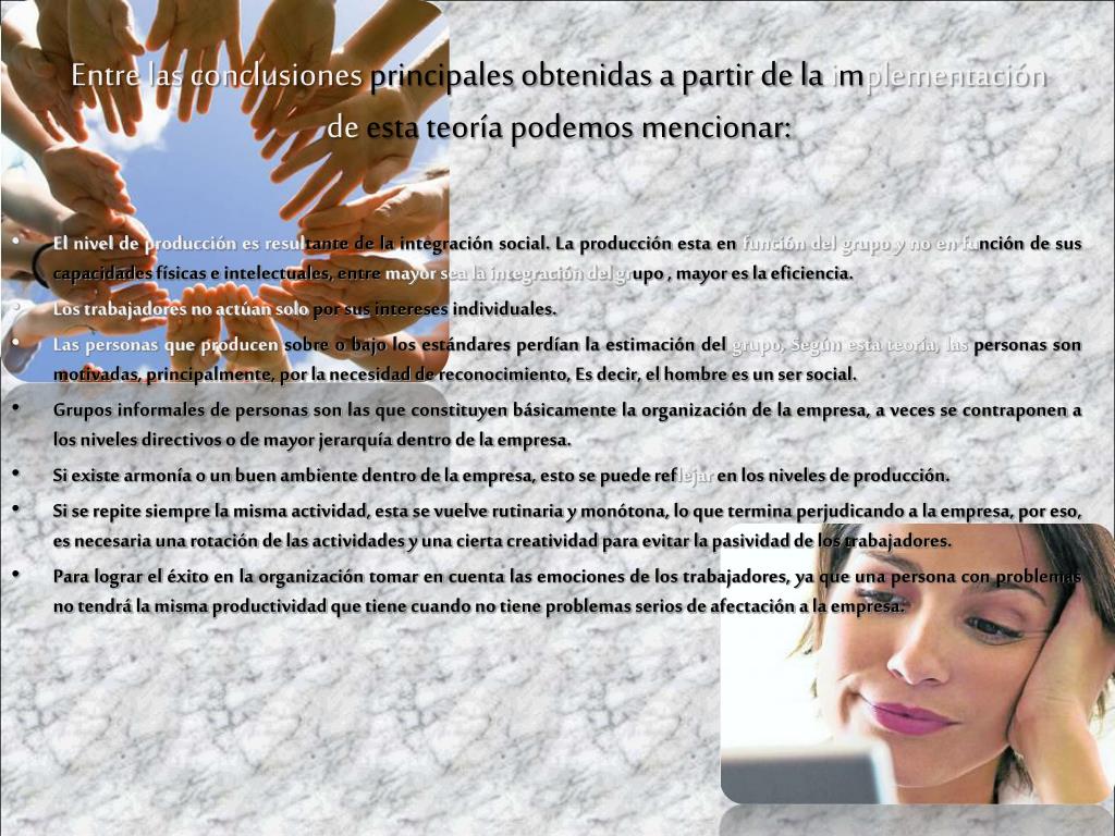 Entre las conclusiones principales obtenidas a partir de la implementación de esta teoría podemos mencionar: • El nivel de producción es resultante de la integración social. La producción esta en función del grupo y no en función de sus capacidades físicas e intelectuales, entre mayor sea la integración del grupo , mayor es la eficiencia. • Los trabajadores no actúan solo por sus intereses individuales. • Las personas que producen sobre o bajo los estándares perdían la estimación del grupo, Según esta teoría, las personas son motivadas, principalmente, por la necesidad de reconocimiento, Es decir, el hombre es un ser social. • Grupos informales de personas son las que constituyen básicamente la organización de la empresa, a veces se contraponen a los niveles directivos o de mayor jerarquía dentro de la empresa. • Si existe armonía o un buen ambiente dentro de la empresa, esto se puede reflejar en los niveles de producción. • Si se repite siempre la misma actividad, esta se vuelve rutinaria y monótona, lo que termina perjudicando a la empresa, por eso, es necesaria una rotación de las actividades y una cierta creatividad para evitar la pasividad de los trabajadores. • Para lograr el éxito en la organización tomar en cuenta las emociones de los trabajadores, ya que una persona con problemas no tendrá la misma productividad que tiene cuando no tiene problemas serios de afectación a la empresa.