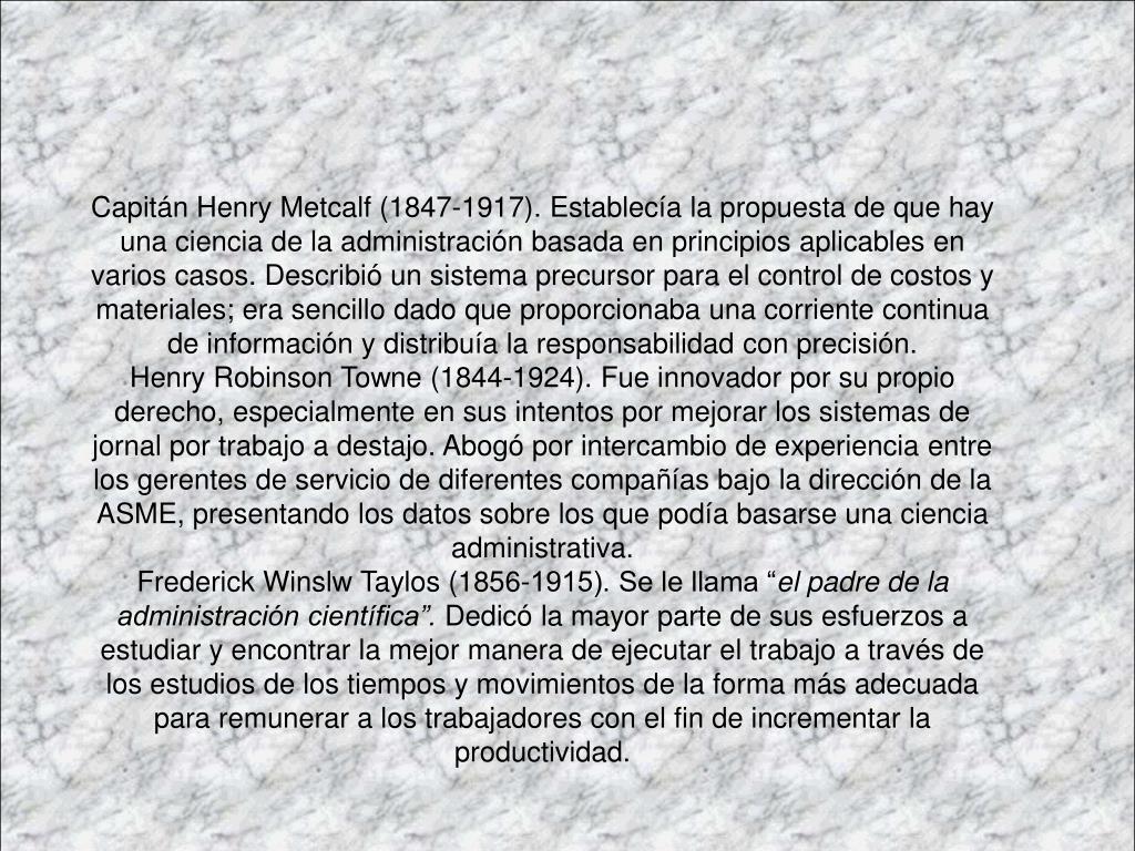 Capitán Henry Metcalf (1847-1917). Establecía la propuesta de que hay una ciencia de la administración basada en principios aplicables en varios casos. Describió un sistema precursor para el control de costos y materiales; era sencillo dado que proporcionaba una corriente continua de información y distribuía la responsabilidad con precisión. Henry Robinson Towne (1844-1924). Fue innovador por su propio derecho, especialmente en sus intentos por mejorar los sistemas de jornal por trabajo a destajo. Abogó por intercambio de experiencia entre los gerentes de servicio de diferentes compañías bajo la dirección de la ASME, presentando los datos sobre los que podía basarse una ciencia administrativa. Frederick Winslw Taylos (1856-1915). Se le llama “el padre de la administración científica”. Dedicó la mayor parte de sus esfuerzos a estudiar y encontrar la mejor manera de ejecutar el trabajo a través de los estudios de los tiempos y movimientos de la forma más adecuada para remunerar a los trabajadores con el fin de incrementar la productividad.