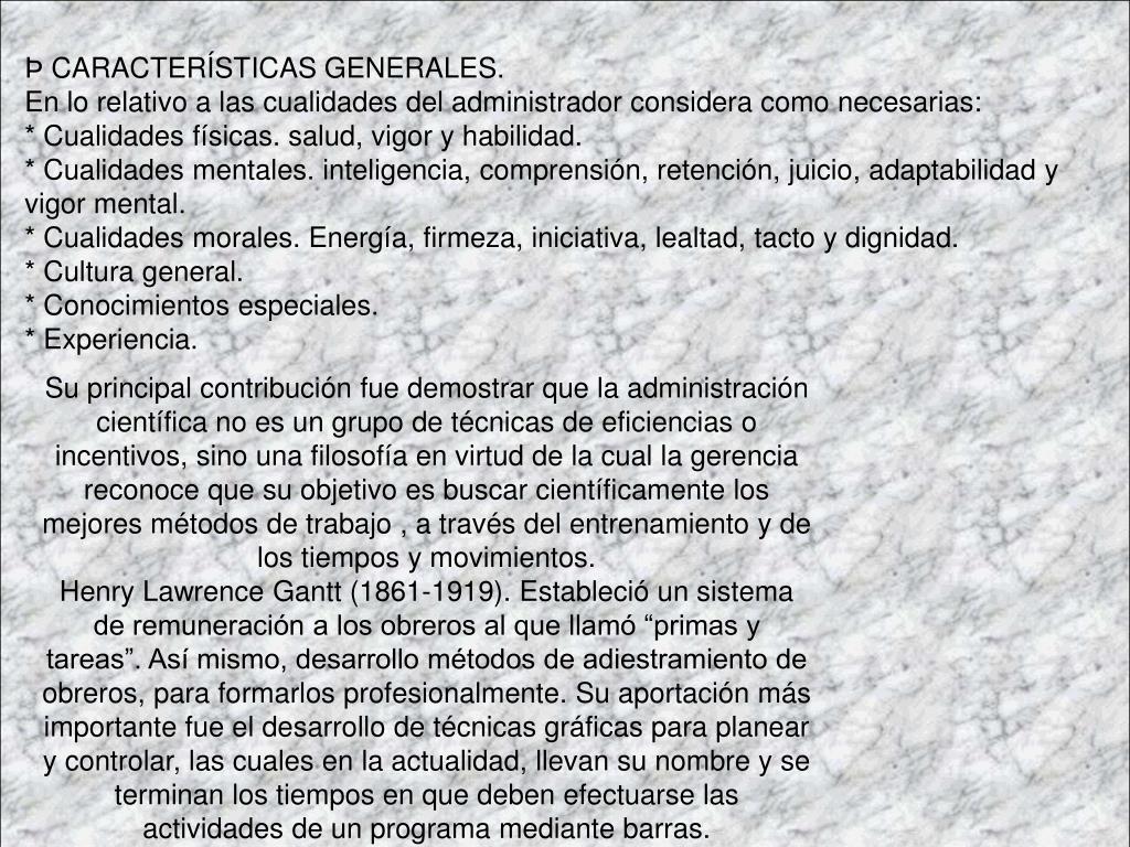 Þ CARACTERÍSTICAS GENERALES.En lo relativo a las cualidades del administrador considera como necesarias:* Cualidades físicas. salud, vigor y habilidad.* Cualidades mentales. inteligencia, comprensión, retención, juicio, adaptabilidad y vigor mental.* Cualidades morales. Energía, firmeza, iniciativa, lealtad, tacto y dignidad.* Cultura general.* Conocimientos especiales.* Experiencia. Su principal contribución fue demostrar que la administración científica no es un grupo de técnicas de eficiencias o incentivos, sino una filosofía en virtud de la cual la gerencia reconoce que su objetivo es buscar científicamente los mejores métodos de trabajo , a través del entrenamiento y de los tiempos y movimientos. Henry Lawrence Gantt (1861-1919). Estableció un sistema de remuneración a los obreros al que llamó “primas y tareas”. Así mismo, desarrollo métodos de adiestramiento de obreros, para formarlos profesionalmente. Su aportación más importante fue el desarrollo de técnicas gráficas para planear y controlar, las cuales en la actualidad, llevan su nombre y se terminan los tiempos en que deben efectuarse las actividades de un programa mediante barras.