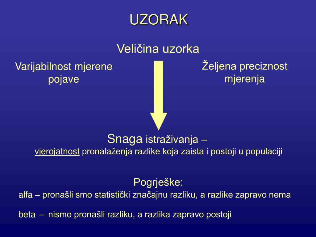 UZORAK Veličina uzorka Željena preciznostmjerenja Varijabilnost mjerenepojave Snaga istraživanja – vjerojatnost pronalaženja razlike koja zaista i postoji u populaciji Pogrješke: alfa – pronašli smo statistički značajnu razliku, a razlike zapravo nema beta–nismo pronašli razliku, a razlika zapravo postoji