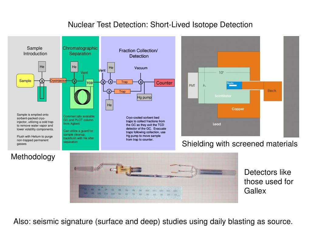 Nuclear Test Detection: Short-Lived Isotope Detection Shielding with screened materials Methodology Detectors like those used for Gallex Also: seismic signature (surface and deep) studies using daily blasting as source.