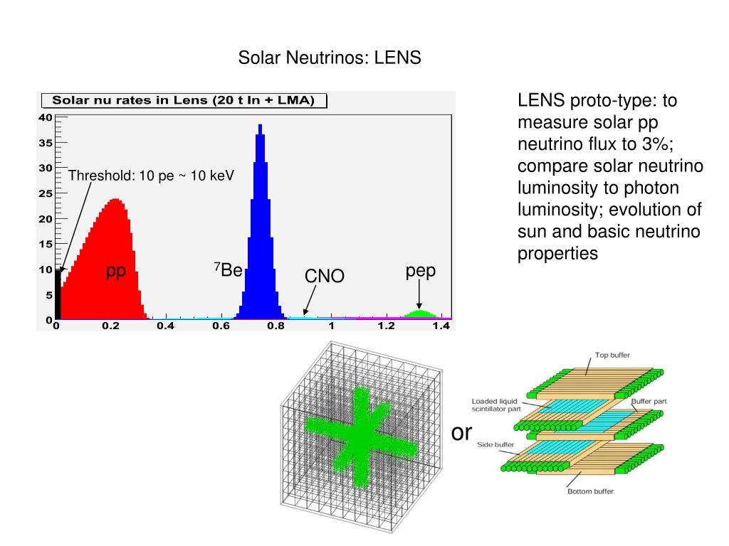 Solar Neutrinos: LENS LENS proto-type: to measure solar pp neutrino flux to 3%; compare solar neutrino luminosity to photon luminosity; evolution of sun and basic neutrino properties Threshold: 10 pe ~ 10 keV pp 7Be pep CNO or