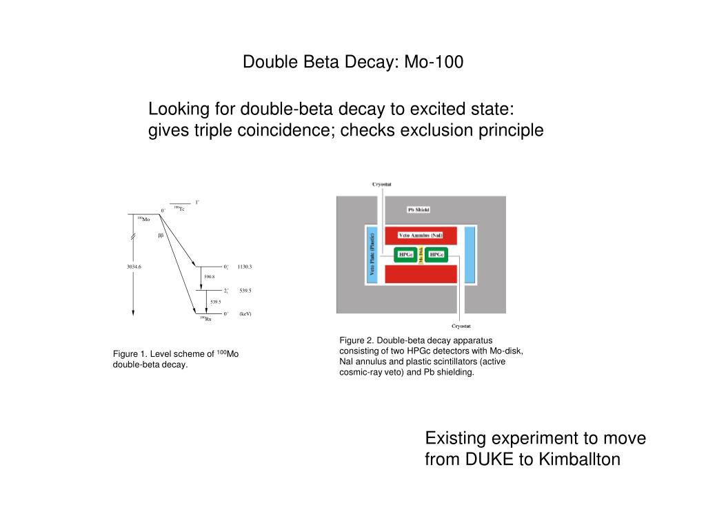Double Beta Decay: Mo-100 Looking for double-beta decay to excited state: gives triple coincidence; checks exclusion principle Figure 2. Double-beta decay apparatus consisting of two HPGc detectors with Mo-disk, NaI annulus and plastic scintillators (active cosmic-ray veto) and Pb shielding. Figure 1. Level scheme of 100Mo double-beta decay. Existing experiment to move from DUKE to Kimballton