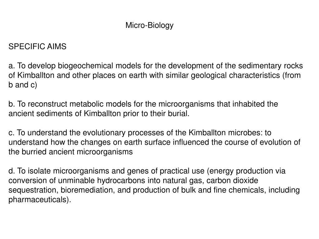 Micro-Biology SPECIFIC AIMS a. To develop biogeochemical models for the development of the sedimentary rocks of Kimballton and other places on earth with similar geological characteristics (from b and c) b. To reconstruct metabolic models for the microorganisms that inhabited the ancient sediments of Kimballton prior to their burial. c. To understand the evolutionary processes of the Kimballton microbes: to understand how the changes on earth surface influenced the course of evolution of the burried ancient microorganisms d. To isolate microorganisms and genes of practical use (energy production via conversion of unminable hydrocarbons into natural gas, carbon dioxide sequestration, bioremediation, and production of bulk and fine chemicals, including pharmaceuticals).