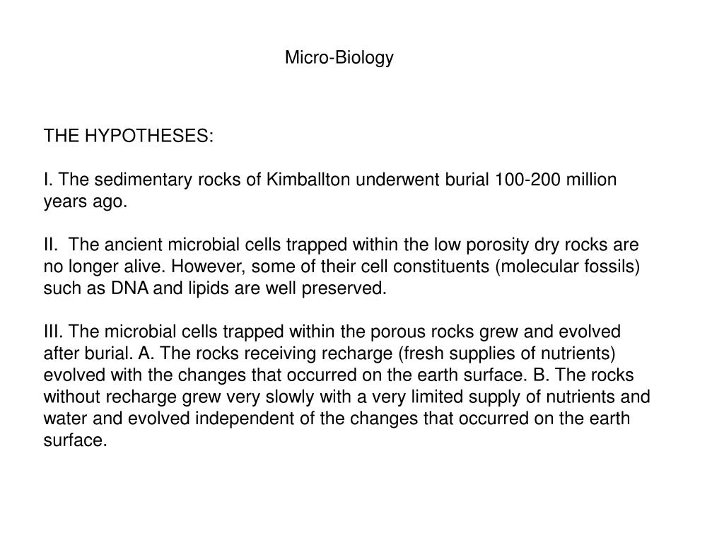 Micro-Biology THE HYPOTHESES: I. The sedimentary rocks of Kimballton underwent burial 100-200 million years ago. II. The ancient microbial cells trapped within the low porosity dry rocks are no longer alive. However, some of their cell constituents (molecular fossils) such as DNA and lipids are well preserved. III. The microbial cells trapped within the porous rocks grew and evolved after burial. A. The rocks receiving recharge (fresh supplies of nutrients) evolved with the changes that occurred on the earth surface. B. The rocks without recharge grew very slowly with a very limited supply of nutrients and water and evolved independent of the changes that occurred on the earth surface.