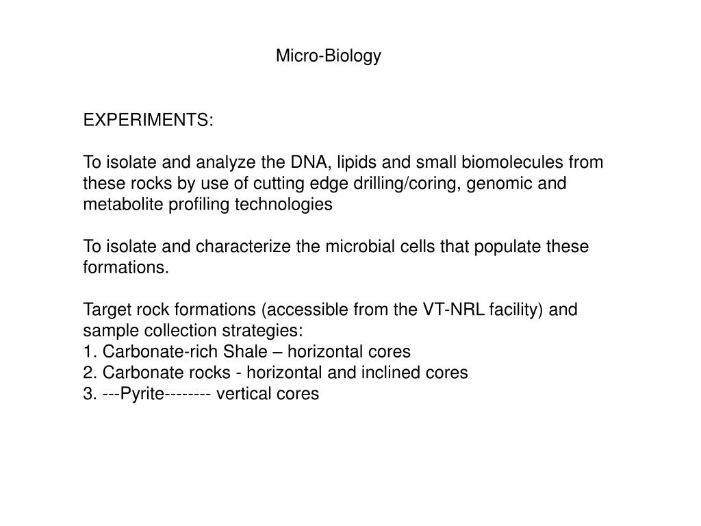 Micro-Biology EXPERIMENTS: To isolate and analyze the DNA, lipids and small biomolecules from these rocks by use of cutting edge drilling/coring, genomic and metabolite profiling technologies To isolate and characterize the microbial cells that populate these formations. Target rock formations (accessible from the VT-NRL facility) and sample collection strategies: 1. Carbonate-rich Shale – horizontal cores 2. Carbonate rocks - horizontal and inclined cores 3. ---Pyrite-------- vertical cores