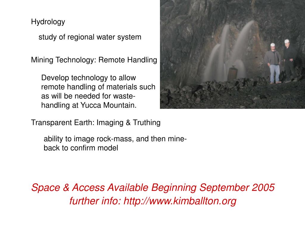 Hydrology study of regional water system Mining Technology: Remote Handling Develop technology to allow remote handling of materials such as will be needed for waste-handling at Yucca Mountain. Transparent Earth: Imaging & Truthing ability to image rock-mass, and then mine-back to confirm model Space & Access Available Beginning September 2005 further info: http://www.kimballton.org