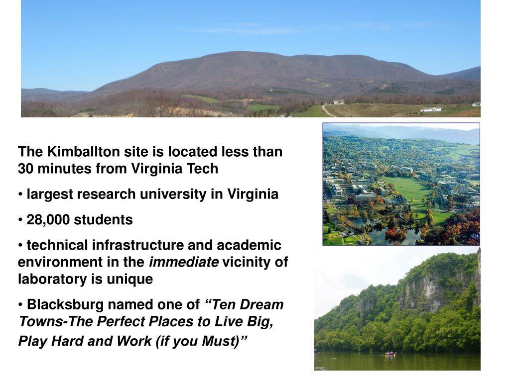 The Kimballton site is located less than 30 minutes from Virginia Tech • largest research university in Virginia • 28,000 students • technical infrastructure and academic environment in the immediate vicinity of laboratory is unique • Blacksburg named one of “Ten Dream Towns-The Perfect Places to Live Big, Play Hard and Work (if you Must)”