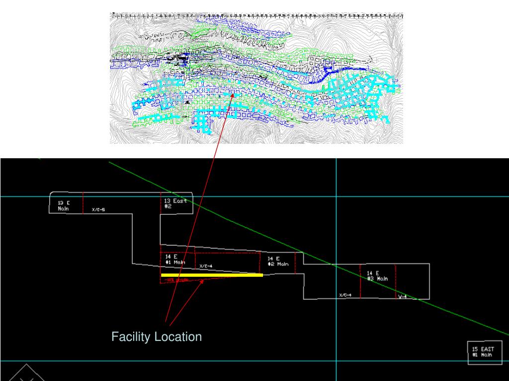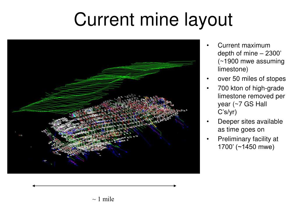Current mine layout • Current maximum depth of mine – 2300’ (~1900 mwe assuming limestone) • over 50 miles of stopes • 700 kton of high-grade limestone removed per year (~7 GS Hall C’s/yr) • Deeper sites available as time goes on • Preliminary facility at 1700’ (~1450 mwe) ~ 1 mile