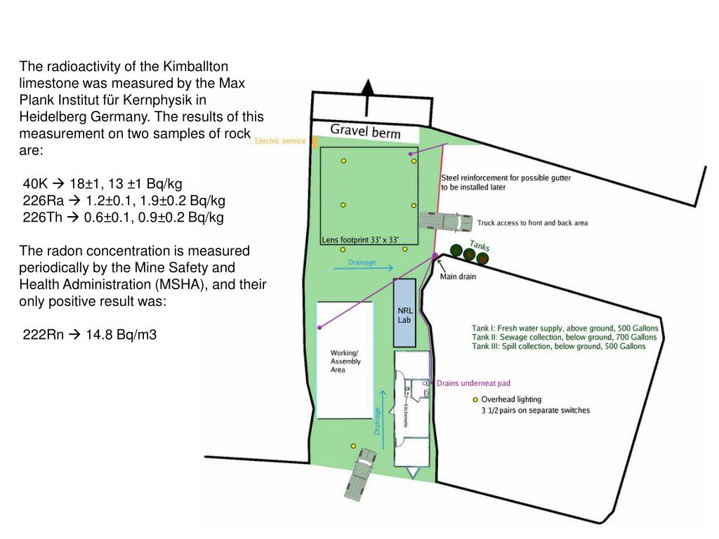 The radioactivity of the Kimballton limestone was measured by the Max Plank Institut für Kernphysik in Heidelberg Germany. The results of this measurement on two samples of rock are: 40K 18±1, 13 ±1 Bq/kg 226Ra 1.2±0.1, 1.9±0.2 Bq/kg 226Th 0.6±0.1, 0.9±0.2 Bq/kg The radon concentration is measured periodically by the Mine Safety and Health Administration (MSHA), and their only positive result was: 222Rn 14.8 Bq/m3