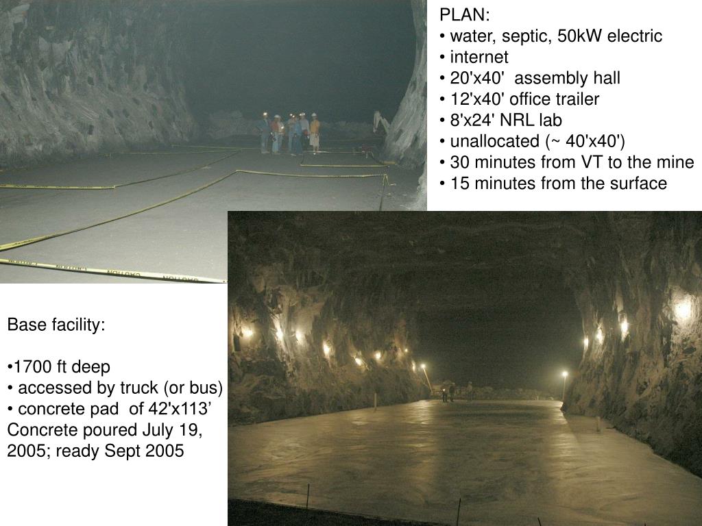 PLAN: • water, septic, 50kW electric • internet • 20'x40' assembly hall • 12'x40' office trailer • 8'x24' NRL lab • unallocated (~ 40'x40') • 30 minutes from VT to the mine • 15 minutes from the surface • Base facility: • 1700 ft deep • accessed by truck (or bus) • concrete pad of 42'x113’ • Concrete poured July 19, 2005; ready Sept 2005