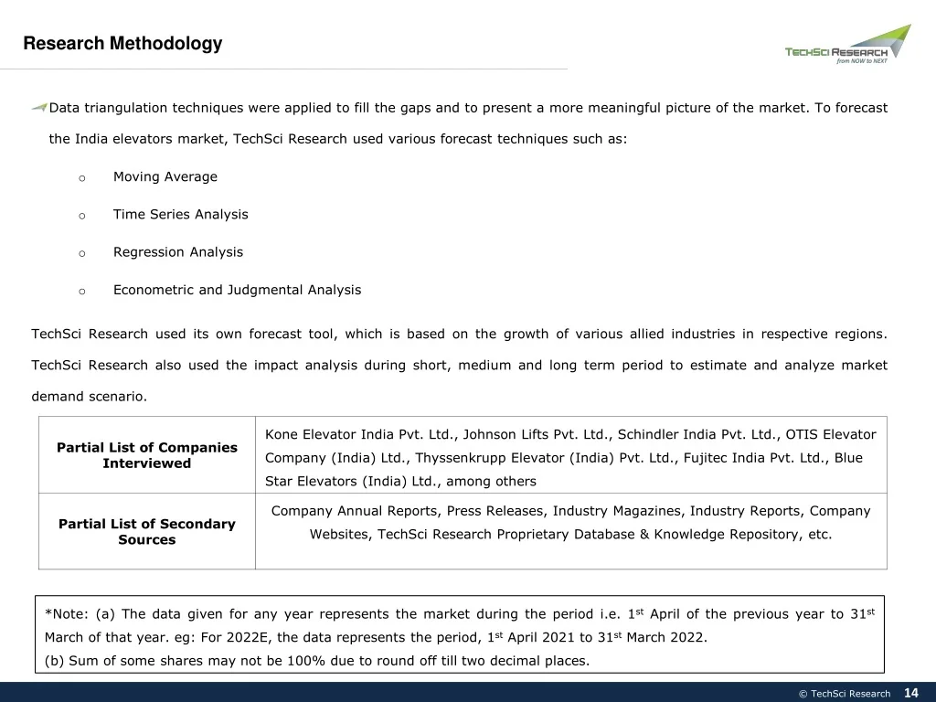 Research Methodology Respondents were asked about the current and future market growth rates, as well as market shares by type of machinery, by weight, by end user, by type of carriage, by type of elevator door, by region, and by company. Removing the outlier responses, the geometric mean of growth estimates and provider wise revenue shares generated across various segments were considered, to arrive at the final revenue shares. Revenue shares generated across various segments were further triangulated from other stakeholders depending upon the component. Methodology Followed for Calculation of Market Shares: Market shares by type of machinery, by weight, by end user, by type of carriage, by type of elevator door, by region, and by company were calculated based on the responses received through primary surveys with industry experts, in which the respondents were asked about the market shares of the leading distribution transformers players. The final shares were calculated by taking the geometric mean of the responses gathered from key opinion leaders after eliminating the outliers. Moreover, respondents were asked about the leading companies operating in the India elevators market. Methodology Followed for Forecasting: TechSci Research performed periodical checks on data collected through the surveys with logical checks and analyzed the survey results in SPSS/Tableau Software. 13 13 © TechSci Research
