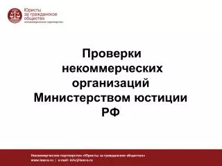 Проверки некоммерческих организаций Министерством юстиции РФ. 1. 1. Некоммерческое партнерство «Юристы за гражданское общество» www.lawcs.ru | e-mail: info@lawcs.ru. Нормативно правовое регулирование:. 1. ФЗ «О некоммерческих организациях» 2. ФЗ «Об общественных объединениях»