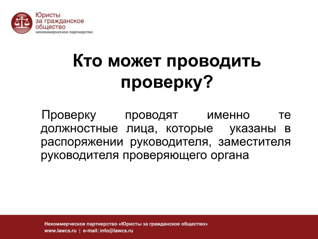 Кто может проводить проверку? Проверку проводят именно те должностные лица, которые указаны в распоряжении руководителя, заместителя руководителя проверяющего органа 1 12 Некоммерческое партнерство «Юристы за гражданское общество» www.lawcs.ru | e-mail: info@lawcs.ru