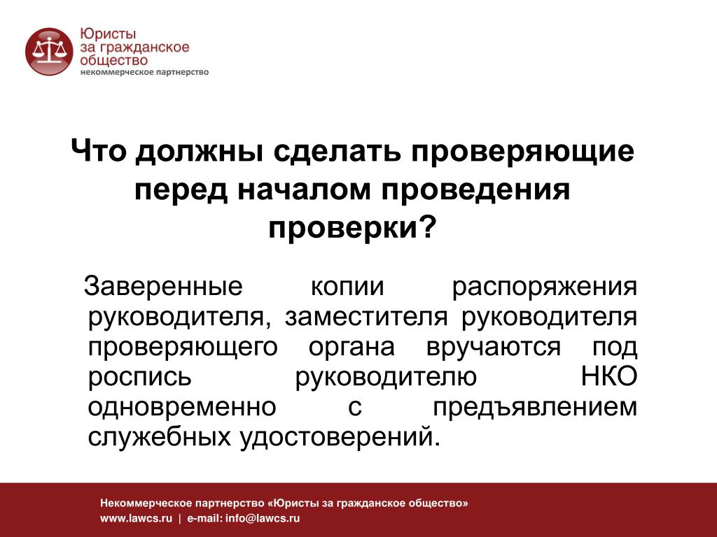 Что должны сделать проверяющие перед началом проведения проверки? Заверенные копии распоряжения руководителя, заместителя руководителя проверяющего органа вручаются под роспись руководителю НКО одновременно с предъявлением служебных удостоверений. 1 13 Некоммерческое партнерство «Юристы за гражданское общество» www.lawcs.ru | e-mail: info@lawcs.ru