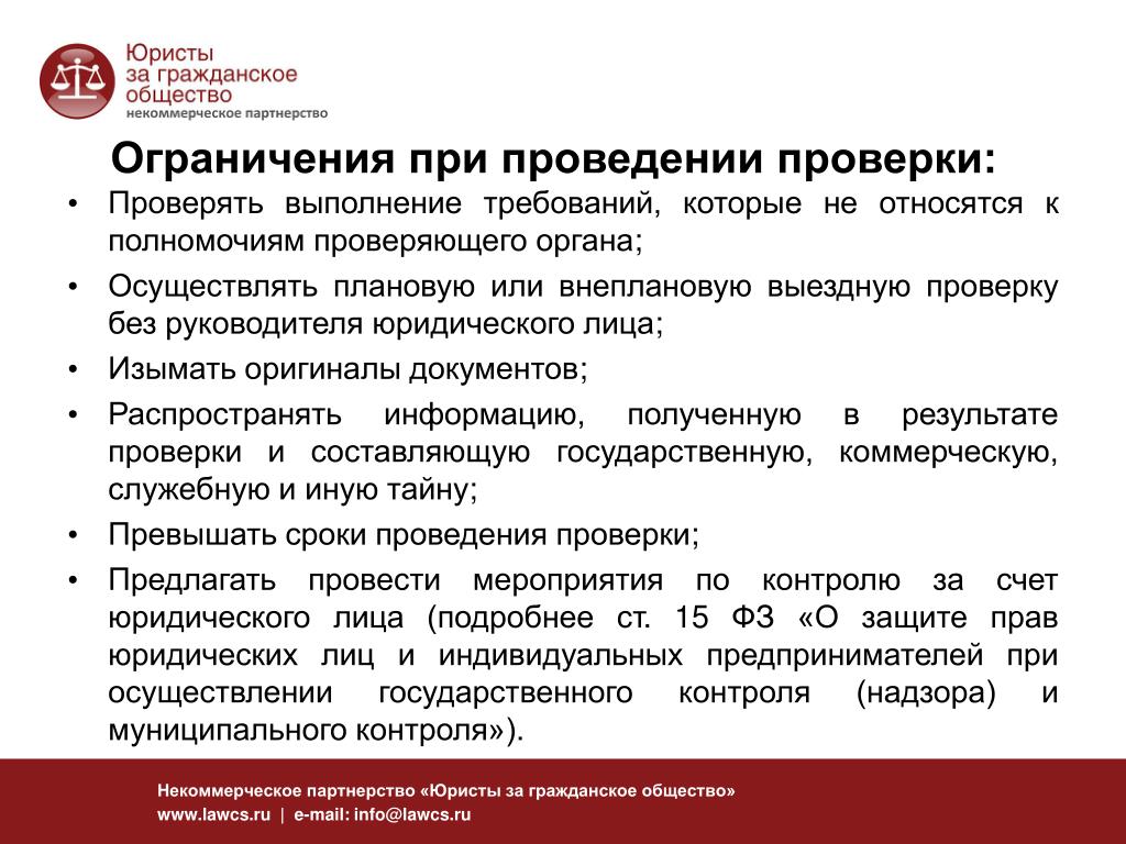 Ограничения при проведении проверки: • Проверять выполнение требований, которые не относятся к полномочиям проверяющего органа; • Осуществлять плановую или внеплановую выездную проверку без руководителя юридического лица; • Изымать оригиналы документов; • Распространять информацию, полученную в результате проверки и составляющую государственную, коммерческую, служебную и иную тайну; • Превышать сроки проведения проверки; • Предлагать провести мероприятия по контролю за счет юридического лица (подробнее ст. 15 ФЗ «О защите прав юридических лиц и индивидуальных предпринимателей при осуществлении государственного контроля (надзора) и муниципального контроля»). 1 14 Некоммерческое партнерство «Юристы за гражданское общество» www.lawcs.ru | e-mail: info@lawcs.ru