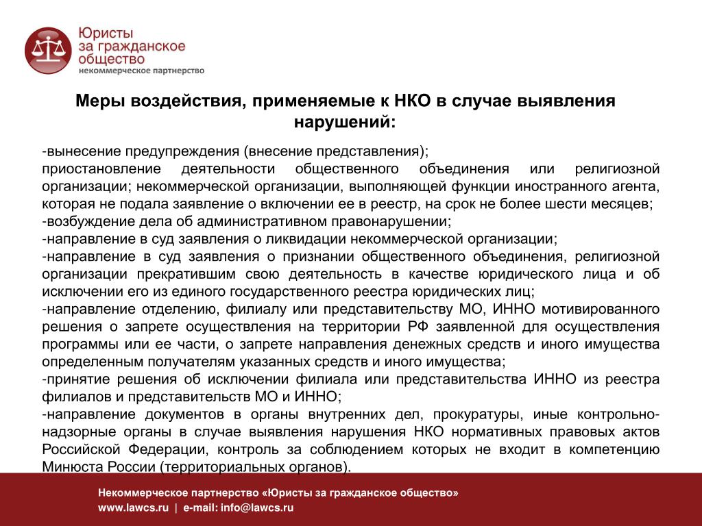 Меры воздействия, применяемые к НКО в случае выявления нарушений: -вынесение предупреждения (внесение представления); приостановление деятельности общественного объединения или религиозной организации; некоммерческой организации, выполняющей функции иностранного агента, которая не подала заявление о включении ее в реестр, на срок не более шести месяцев; -возбуждение дела об административном правонарушении; -направление в суд заявления о ликвидации некоммерческой организации; -направление в суд заявления о признании общественного объединения, религиозной организации прекратившим свою деятельность в качестве юридического лица и об исключении его из единого государственного реестра юридических лиц; -направление отделению, филиалу или представительству МО, ИННО мотивированного решения о запрете осуществления на территории РФ заявленной для осуществления программы или ее части, о запрете направления денежных средств и иного имущества определенным получателям указанных средств и иного имущества; -принятие решения об исключении филиала или представительства ИННО из реестра филиалов и представительств МО и ИННО; -направление документов в органы внутренних дел, прокуратуры, иные контрольно-надзорные органы в случае выявления нарушения НКО нормативных правовых актов Российской Федерации, контроль за соблюдением которых не входит в компетенцию Минюста России (территориальных органов). 1 21 Некоммерческое партнерство «Юристы за гражданское общество» www.lawcs.ru | e-mail: info@lawcs.ru