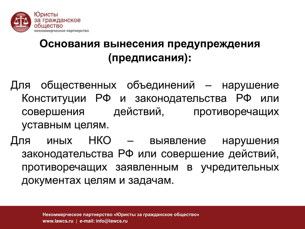 Основания вынесения предупреждения (предписания): Для общественных объединений – нарушение Конституции РФ и законодательства РФ или совершения действий, противоречащих уставным целям. Для иных НКО – выявление нарушения законодательства РФ или совершение действий, противоречащих заявленным в учредительных документах целям и задачам. 1 22 Некоммерческое партнерство «Юристы за гражданское общество» www.lawcs.ru | e-mail: info@lawcs.ru