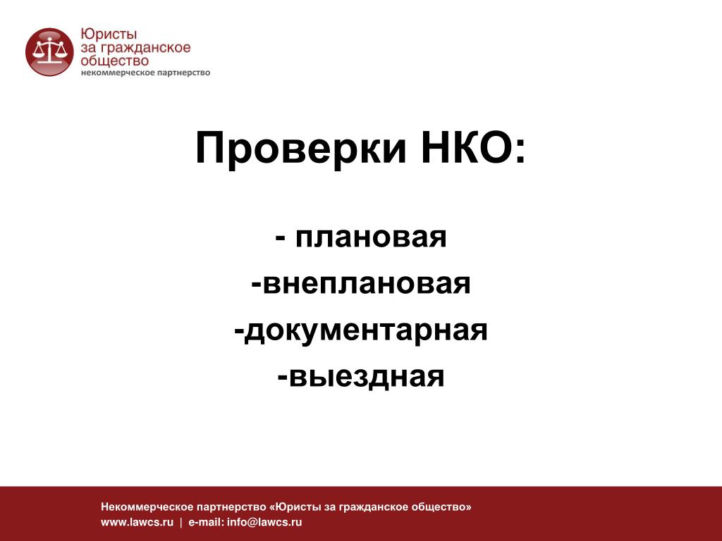 - плановая -внеплановая -документарная -выездная Проверки НКО: 1 3 Некоммерческое партнерство «Юристы за гражданское общество» www.lawcs.ru | e-mail: info@lawcs.ru