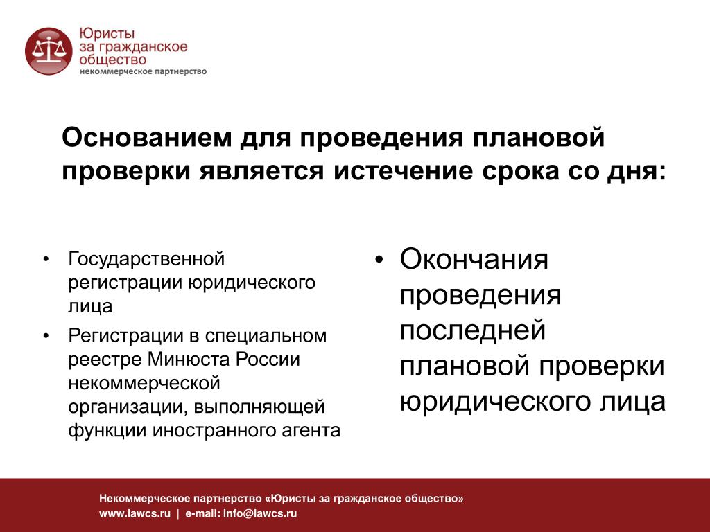 Основанием для проведения плановой проверки является истечение срока со дня: • Окончания проведения последней плановой проверки юридического лица • Государственной регистрации юридического лица • Регистрации в специальном реестре Минюста России некоммерческой организации, выполняющей функции иностранного агента 1 5 Некоммерческое партнерство «Юристы за гражданское общество» www.lawcs.ru | e-mail: info@lawcs.ru