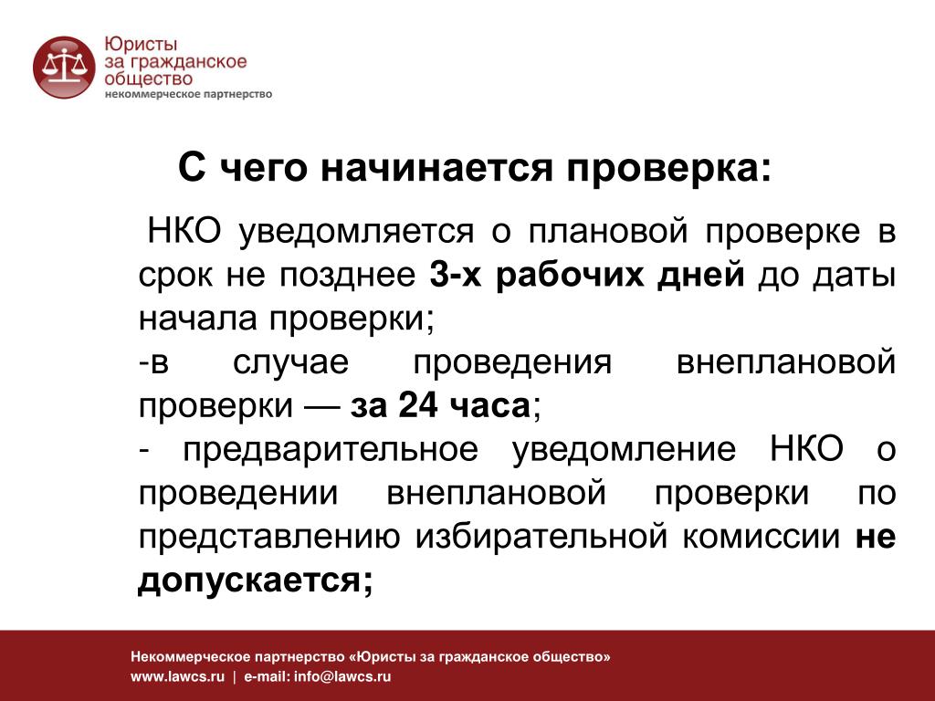 С чего начинается проверка: НКО уведомляется о плановой проверке в срок не позднее 3-х рабочих дней до даты начала проверки; -в случае проведения внеплановой проверки — за 24 часа; - предварительное уведомление НКО о проведении внеплановой проверки по представлению избирательной комиссии не допускается; 1 7 Некоммерческое партнерство «Юристы за гражданское общество» www.lawcs.ru | e-mail: info@lawcs.ru