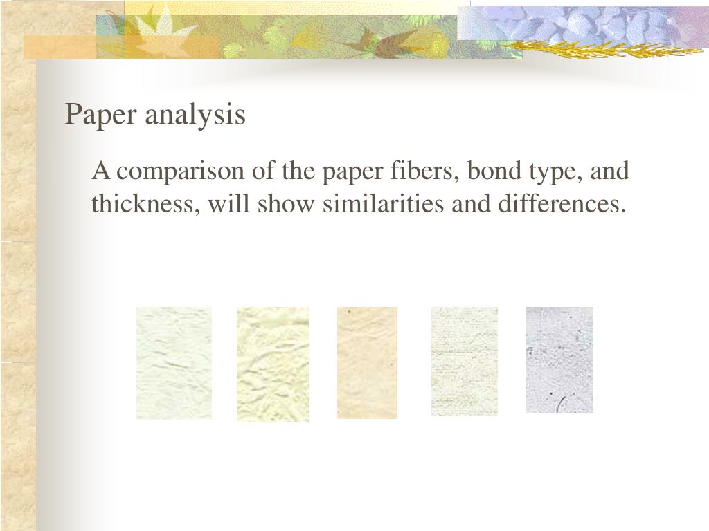 Paper analysis A comparison of the paper fibers, bond type, and thickness, will show similarities and differences.