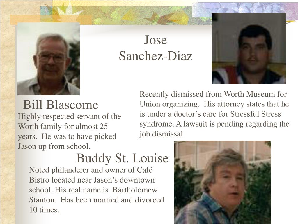 Jose Sanchez-Diaz Recently dismissed from Worth Museum for Union organizing. His attorney states that he is under a doctor’s care for Stressful Stress syndrome. A lawsuit is pending regarding the job dismissal. Bill Blascome Highly respected servant of the Worth family for almost 25 years. He was to have picked Jason up from school. Buddy St. Louise Noted philanderer and owner of Café Bistro located near Jason’s downtown school. His real name is Bartholomew Stanton. Has been married and divorced 10 times.