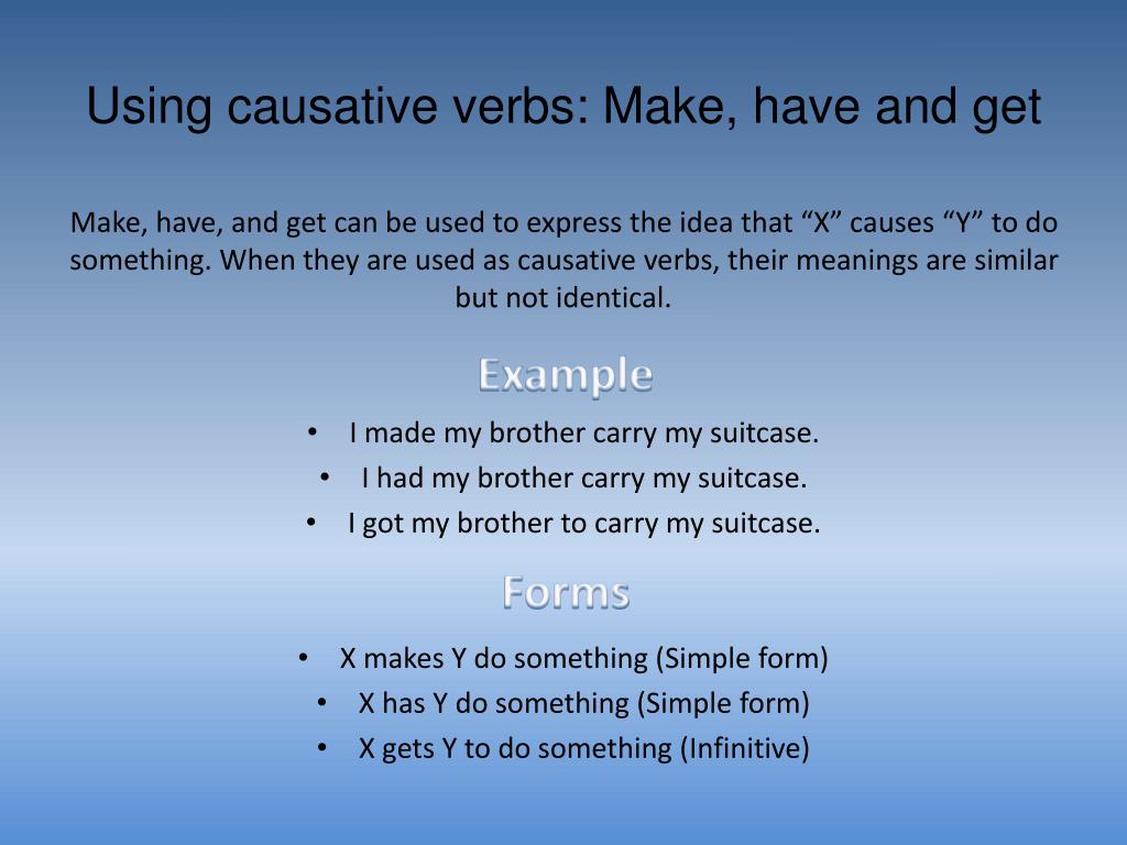 Using causative verbs: Make, have and get Make, have, and get can be used to express the idea that “X” causes “Y” to do something. When they are used as causative verbs, their meanings are similar but not identical. • I made my brother carry my suitcase. • I had my brother carry my suitcase. • I got my brother to carry my suitcase. • X makes Y do something (Simple form) • X has Y do something (Simple form) • X gets Y to do something (Infinitive) Example Forms