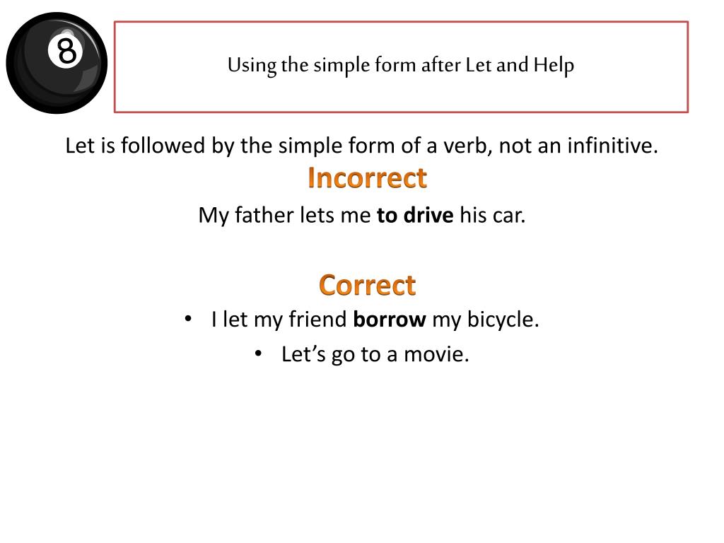 Using the simple form after Let and Help Let is followed by the simple form of a verb, not an infinitive. My father lets me to drive his car. • I let my friend borrow my bicycle. • Let’s go to a movie. Incorrect Correct