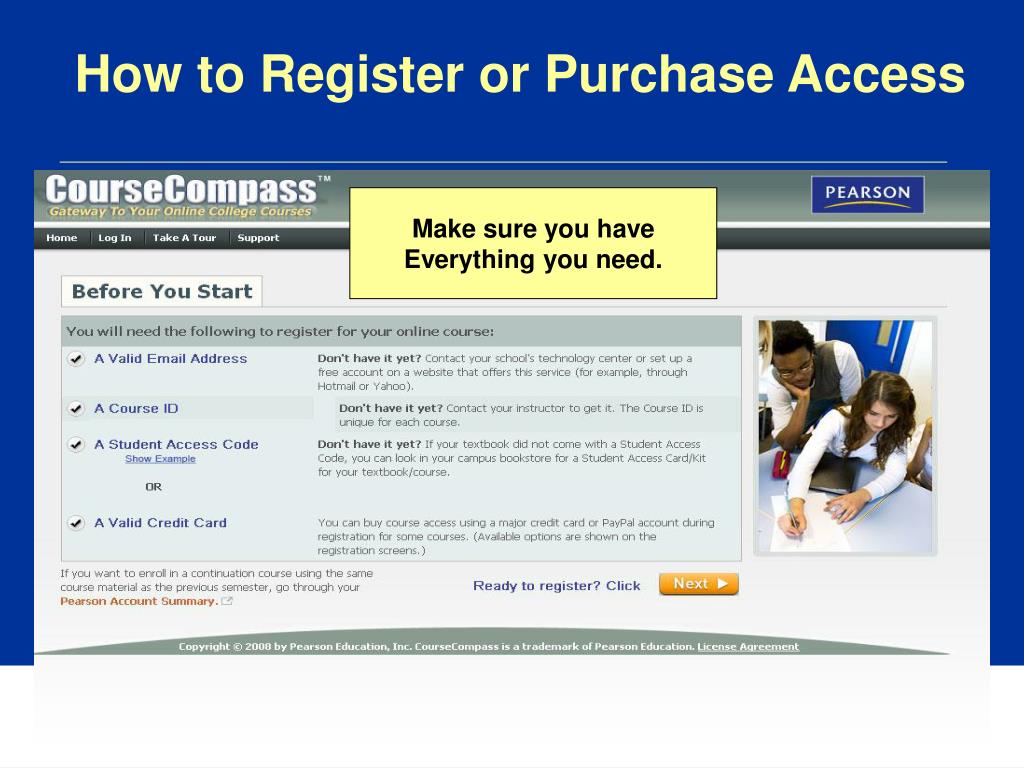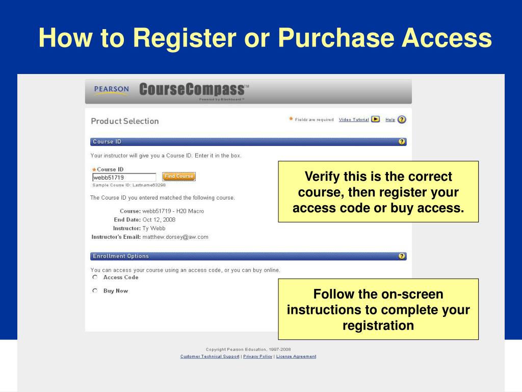 How to Register or Purchase Access Verify this is the correct course, then register your access code or buy access. Follow the on-screen instructions to complete your registration