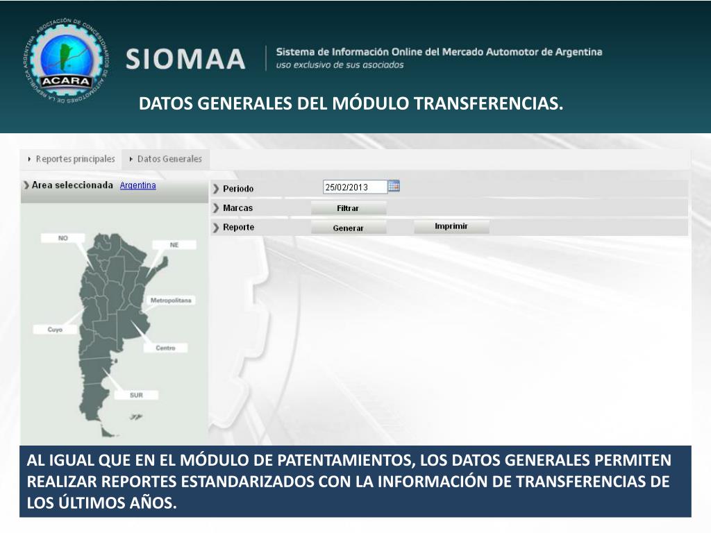 DATOS GENERALES DEL MÓDULO TRANSFERENCIAS. AL IGUAL QUE EN EL MÓDULO DE PATENTAMIENTOS, LOS DATOS GENERALES PERMITEN REALIZAR REPORTES ESTANDARIZADOS CON LA INFORMACIÓN DE TRANSFERENCIAS DE LOS ÚLTIMOS AÑOS.