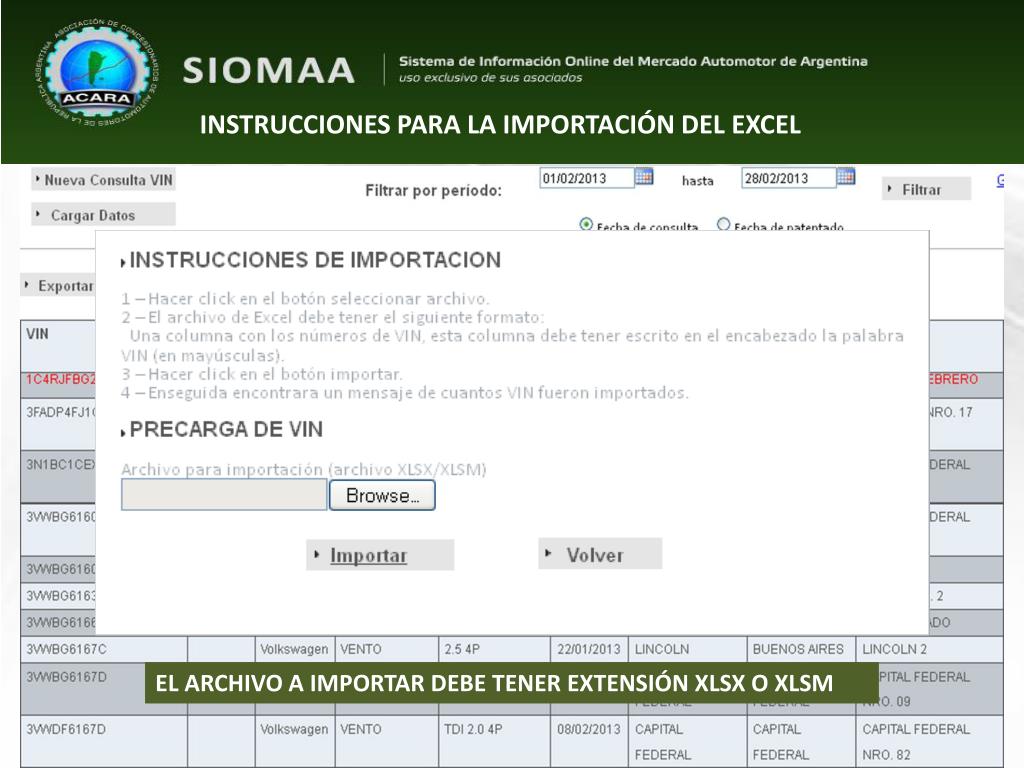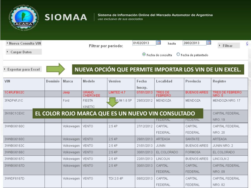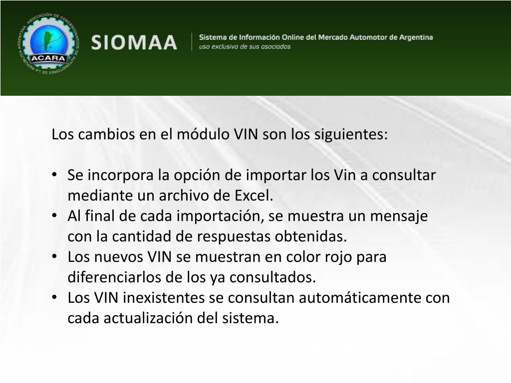 NUEVOS SERVICIOS DE SIOMAA. MÓDULO DE VIN. Los cambios en el módulo VIN son los siguientes: Se incorpora la opción de importar los Vin a consultar mediante un archivo de Excel. Al final de cada importación, se muestra un mensaje con la cantidad de respuestas obtenidas .