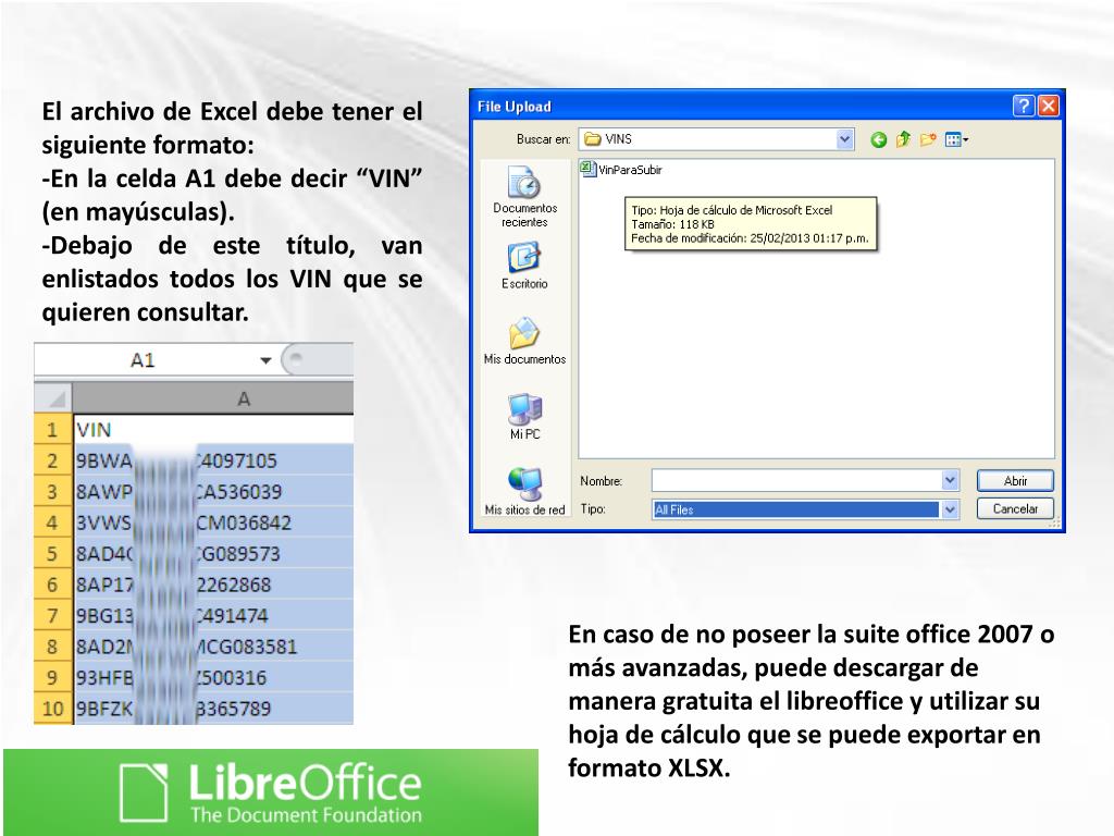 El archivo de Excel debe tener el siguiente formato: -En la celda A1 debe decir “VIN” (en mayúsculas). -Debajo de este título, van enlistados todos los VIN que se quieren consultar. En caso de no poseer la suite office 2007 o más avanzadas, puede descargar de manera gratuita el libreoffice y utilizar su hoja de cálculo que se puede exportar en formato XLSX.