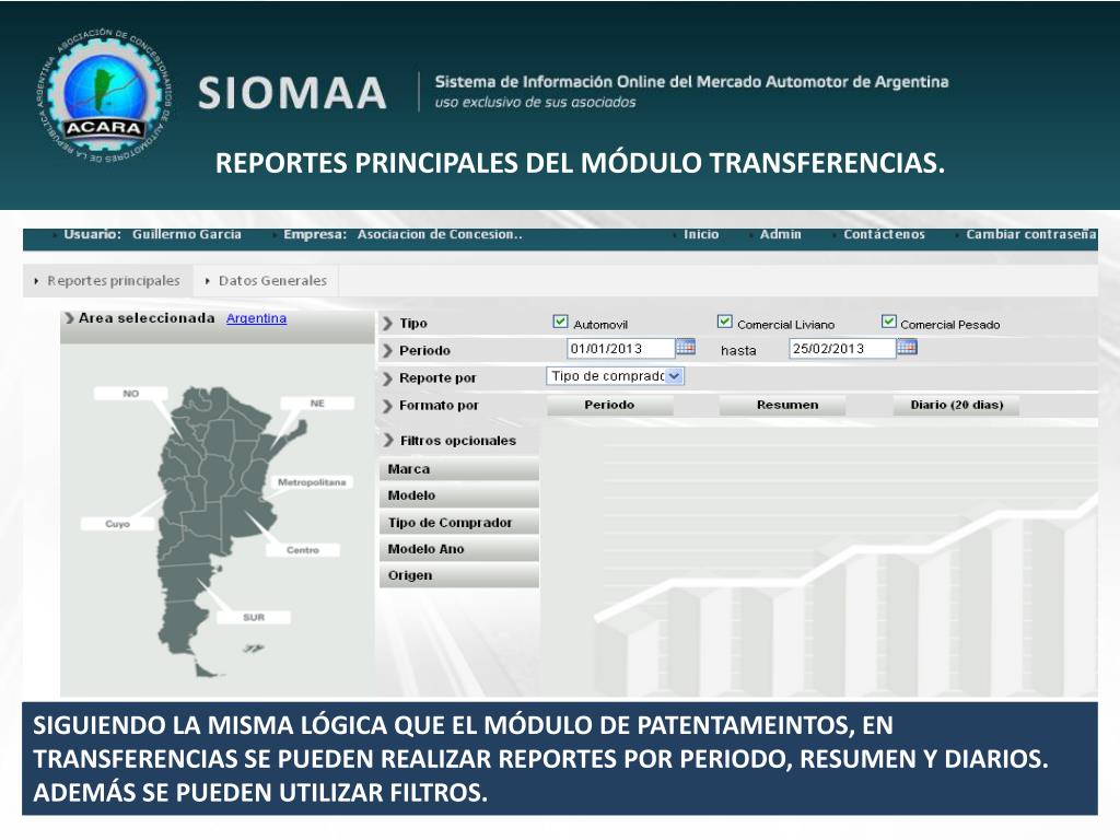 SIOMAA MOBILE PERMITE VER LOS PATENTAMIENTOS TANTO EN REPORTES PRINCIPALES COMO EN DATOS GENERALES. A SIOMAA MOBILE SE INGRESA CON EL MISMO USUARIO Y CONTRASEÑA QUE EN SIOMAA.
