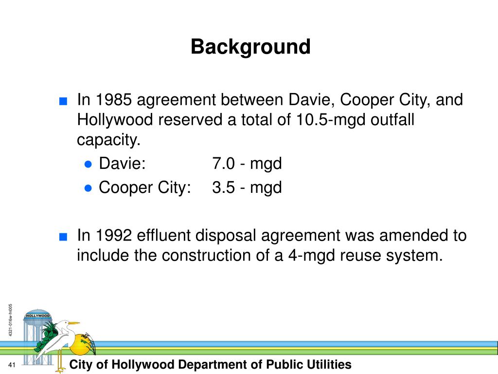Background • In 1985 agreement between Davie, Cooper City, and Hollywood reserved a total of 10.5-mgd outfall capacity. • Davie: 7.0 - mgd • Cooper City: 3.5 - mgd • In 1992 effluent disposal agreement was amended to include the construction of a 4-mgd reuse system.